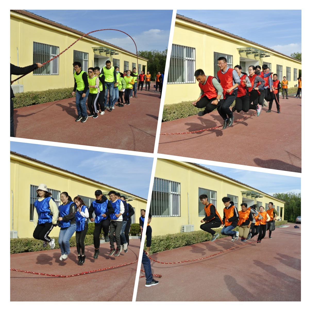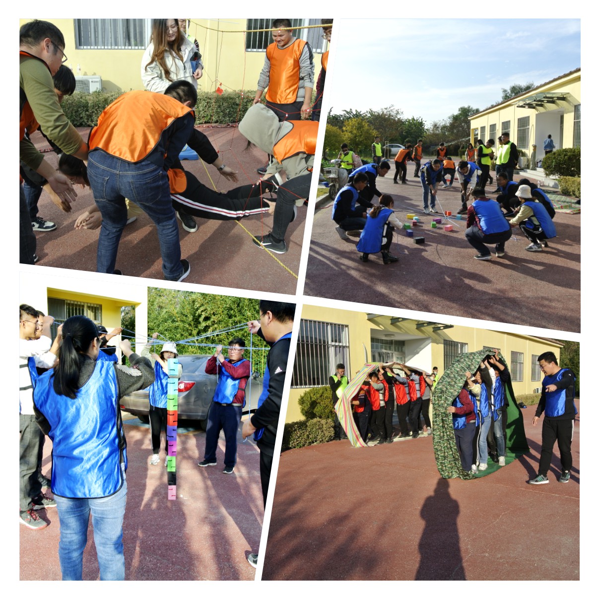 本次趣味運(yùn)動(dòng)會(huì)設(shè)有跳大繩、穿越電網(wǎng)、車(chē)輪滾滾、合力建塔、袋鼠跳跳、信任天梯、拔河七個(gè)比賽項(xiàng)目。參賽隊(duì)員全部打亂順序混編成四組,并推選出一名隊(duì)長(zhǎng)。“跳大繩”作為傳統(tǒng)比賽項(xiàng)目?jī)?yōu)先登場(chǎng),由兩名隊(duì)員搖繩把握節(jié)奏,跳繩隊(duì)員快慢有序穿梭于繩索之間,隊(duì)長(zhǎng)統(tǒng)一指揮、技術(shù)協(xié)作奠定了取勝的關(guān)鍵。“穿越電網(wǎng)”項(xiàng)目發(fā)揮的是隊(duì)員們?nèi)翰呷椭腔哿α康娜诤?,比賽異常激烈。?ldquo;車(chē)輪滾滾”項(xiàng)目環(huán)節(jié)中,各隊(duì)隊(duì)員們齊心協(xié)力,保持口令一致、步調(diào)一致、節(jié)奏一致,穩(wěn)步前行地沖向終點(diǎn)。合力建塔、袋鼠跳跳、信任天梯、拔河等項(xiàng)目也在各隊(duì)的拼搏和歡快中逐一完賽。